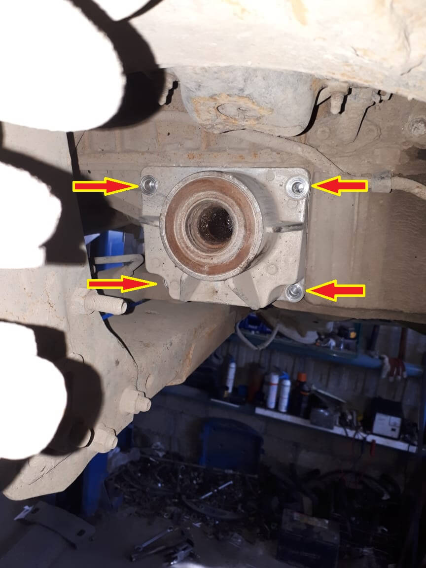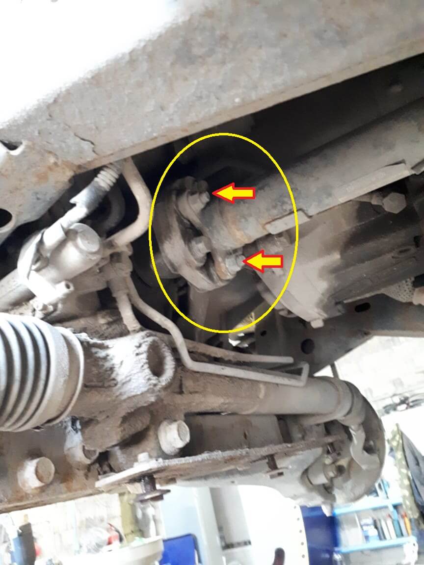 Далее еще выкручиваем 4 болта с фланца раздатки.Снимаем передний карданный вал.