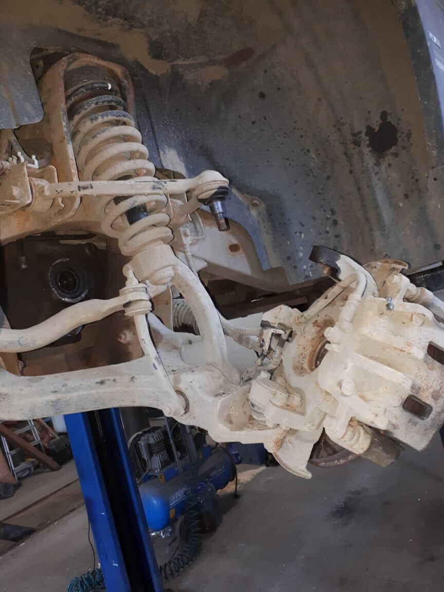 Используя любой удобный съёмник, выпрессовываем сначала рулевой наконечник, затем верхнюю шаровую. Аналогичную операцию делаем с другой стороны. Снимались очень тяжело, поэтому для облегчения процедуры использовалась алюминиевая болванка и молоток (весом приблизительно 800 грамм).