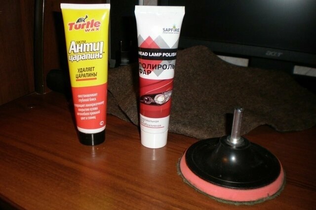 Для полировки не рекомендуется брать бытовую химию, пасту ГОИ, фетровую ткань и т.п. Все расходники можно приобрести в магазинах автохимии и автокосметики. Специалисты рекомендуют пользоваться наборами для реставрации фар таких фирм, как Turtle Wax или Sonax. Опционально используют жидкое стекло для фар. Кроме того, понадобится шлифмашинка, мягкий полировочный круг, а также шлифовальные круги P600, P1000 и P1500.