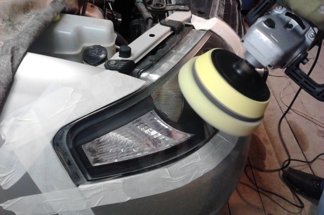 - На оборотах до 3500 в минуту обработайте фару мягким полировочным кругом;