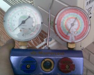 В процессе измерения важно знать, что при нормальной работе кондиционера давление в магистрали всасывания (низкого давления) должно быть в районе 2 бар, а в магистрали нагнетания (высокого давления) — 9...12 бар. Если давление меньше, значит, необходимо проверить работу компрессора.