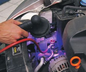 Чтобы использовать для проверки системы кондиционирования на утечку ультрафиолетовую лампу, необходимо предварительно добавить во вновь заправляемый фреон специальный краситель с флуоресцентными свойствами. Он продается отдельно в автомагазинах. Добавлять его нужно в магистраль низкого давления в соответствии с прилагаемой с упаковкой инструкцией.