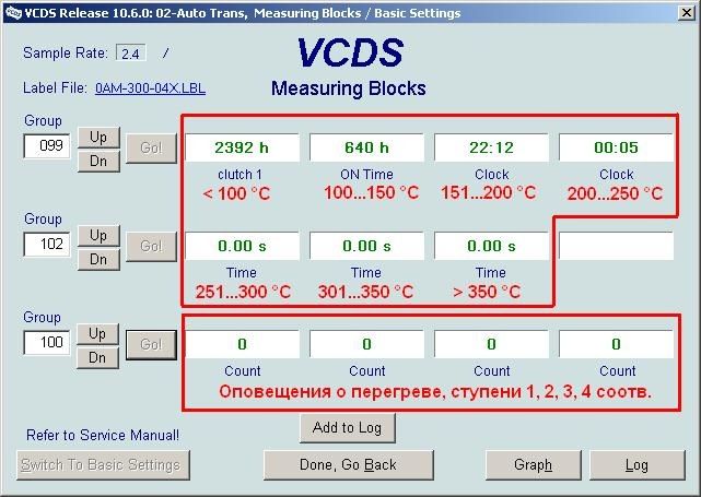 Далее необходимо перейти к температурным характеристикам. Для начала нужно посмотреть статические показатели. Для этого необходимо перейти в группы 99, 102 для первого диска и 119, 122 — для второго. Из показаний можно узнать, работало ли сцепление в критических режимах, и если да, то сколько именно часов. Также на экране можно посмотреть конкретные температурные значения. Чем при меньшей температуре работало сцепление — тем лучше, тем оно менее изношено.