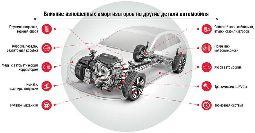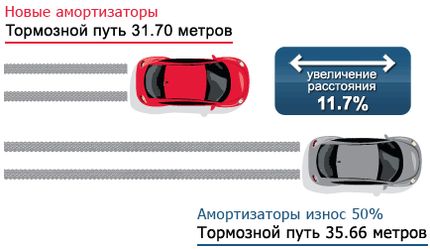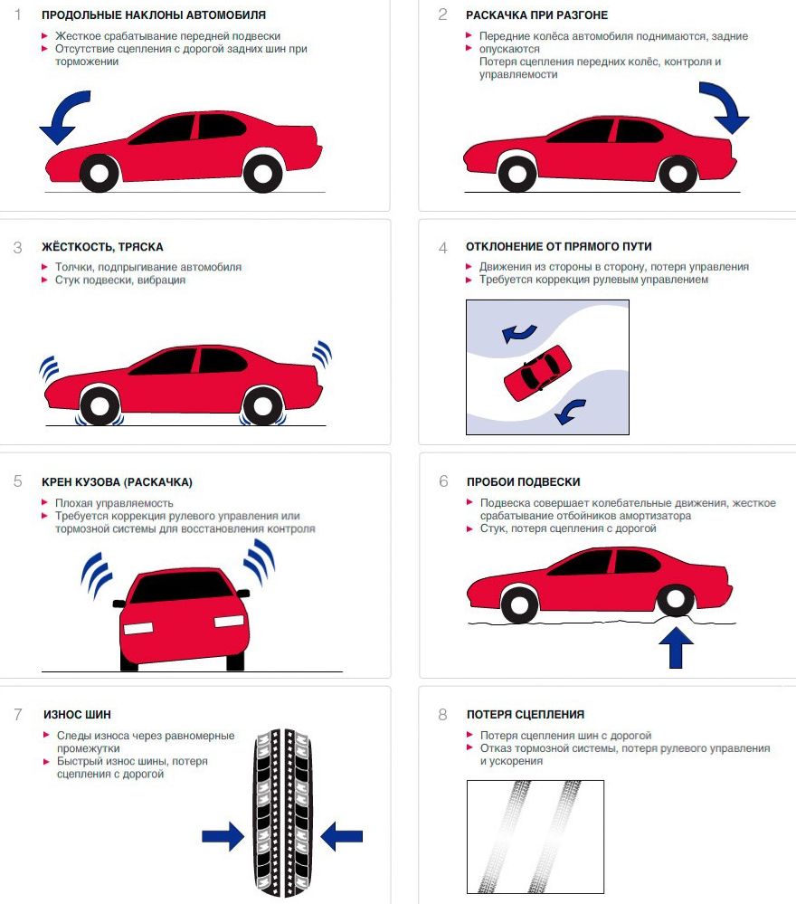 Неисправности амортизаторов сильно влияют на поведение машины на дороге. В частности, корпус автомобиля «ныряет» при разгоне и торможении, увеличивается тормозной путь, сильно кренится во время маневрирования и раскачивается при проезде по неровностям.