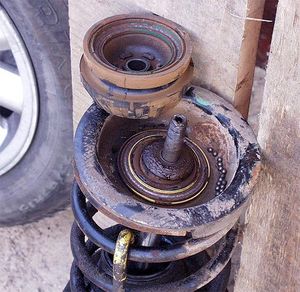 Если проверяются неисправности переднего амортизатора (стойки) нужно выполнить обязательный осмотр пружин и верхних опор. Амортизационные пружины должны быть целыми, не иметь трещин и механических повреждений.