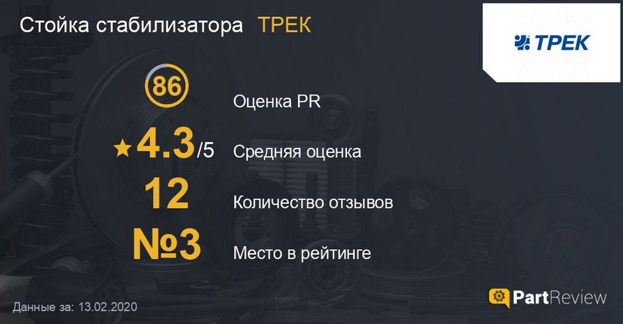 Продукция российского завода ТРЕК неожиданно возглавила рейтинг лучших шаровых опор. Так что стоит ли удивляться, что они делают еще и хорошие стойки стабилизатора. Тем более, что эти детали поставляются на сборочный конвейер PSA и KIA-Spectra в России.