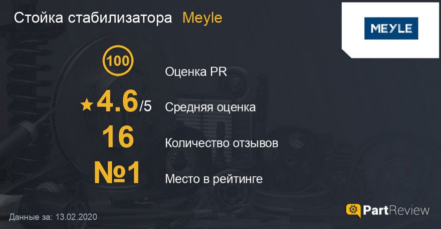Пока что безоговорочный лидер нашего рейтинга — стойки стабилизатора от Meyle. Только у этого бренда в этой категории параметр “Оценка PR” равен 100 из 100 возможных. У стоек от Meyle 16 отзывов и все положительные. Вы хвалите их за ресурс и долговечность (100 000 километров), усиленные версии деталей, качество исполнения, доступную стоимость и «made in Germany». Поэтому из можно считать не просто популярными, а именно лучшими стойками стабилизатора.