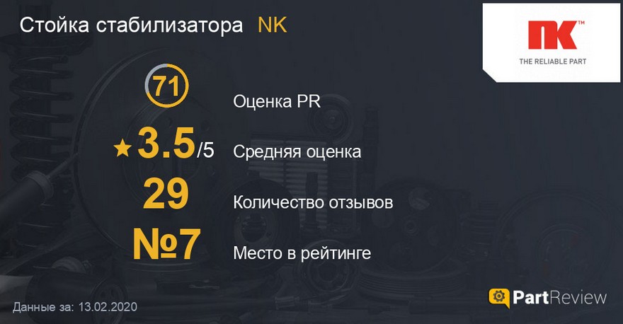Немцы из NK входят в пятерку по количеству отзывов — 29 штук. Правда при этом 6 отрицательных и 4 нейтральных, что и привело их к тем местам, которые вы видите в нашем рейтинге ТОП 7 стоек стабилизатора.