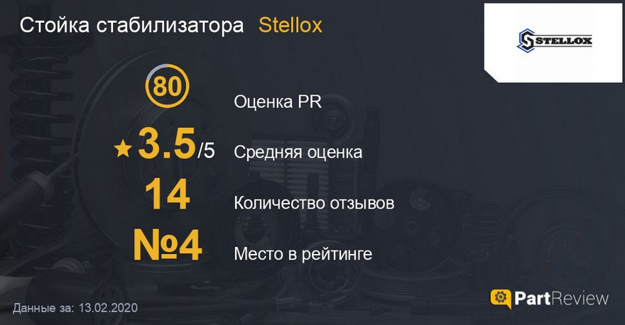 Видимо, Stellox действительно знает где заказывать хорошие детали подвески, потому что вы высоко оцениваете их стойки стабилизатора. У них 14 отзывов и всего 1 негативный.Напомним, что Stellox — это хороший немецкий упаковщик, который заказывает детали по всему миру и продает под своим брендом. Как вы пишете в своих отзывах, они “очень хорошие за свои деньги”.