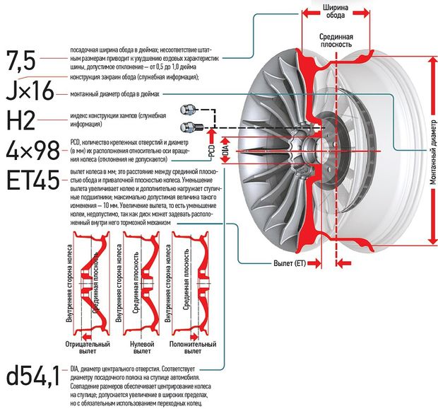 Стандартная маркировка дисков колеса автомобиля наносится непосредственно на его поверхность. Чтобы понять, какие сведения за что отвечают, приведем конкретный пример. Допустим, перед нами автомобильный диск с обозначением 7,5 J x 16 Н2 4×98 ЕТ45 d54.1. Перечислим его расшифровку по порядку.