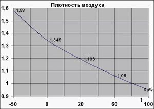 График плотности воздуха по мере повышения температуры (кг/кубометр)