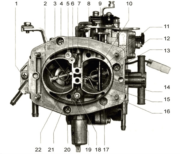 1, 4, 13, 17, 20 — винты крепления крышки карбюратора к корпусу; 2 — малый диффузор (распылитель) главной дозирующей системы второй камеры; 3 — распылитель эконостата; 5 — воздушный жиклер переходной системы второй камеры; 6, 7 — заглушки каналов эконостата; 8, 21 — балансировочные отверстия поплавковой камеры; 9 — ось воздушной заслонки; 10, 15 — винты крепления воздушной заслонки; 11 — малый диффузор (распылитель) второй камеры; 12 — воздушная заслонка; 14 — канал главного воздушного жиклера второй камеры; 16 — канал главного воздушного жиклера первой камеры; 18, 19 — заглушки каналов холостого хода; 22 — распылитель ускорительного насоса