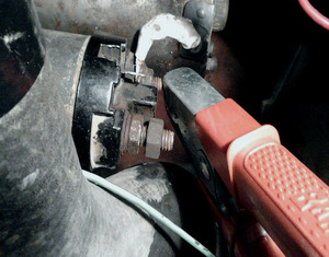- Соединить минусовой контакт источника тока с массой (например, корпусом генератора или минусовой клеммой для АКБ).