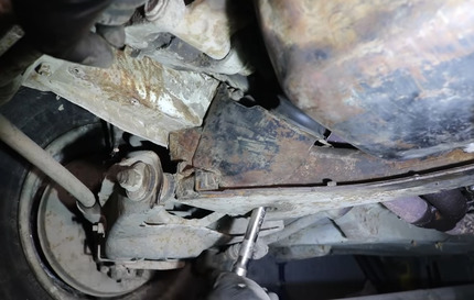 - Используя трещотку с карданчиком или гибким удлинителем и головкой на 17, откручиваем нижнюю гайку через отверстия в балке.