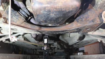 - Заводим поперечину с новой подушкой под коробку, чтобы правая сторона зашла между днищем и выхлопом.