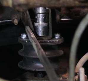 - Чтобы прикрутить подушки к нижней балке, не теряя шайбы, гайки нужно вставить в головку на 17, а шайбы – намазать густой смазкой (солидол, литол-24, ШРУС и т. п.) и приклеить внутри балки или снаружи головки. Таким образом при наживлении гайки на шпильку шайба окажется на своем месте.