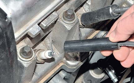 - Выкрутите из ГБЦ свечи зажигания (на бензиновом моторе), свечи накаливания или форсунки (на дизеле). Чтобы не перепутать их при сборке, пронумеруйте свечные наконечники проводов или катушки.