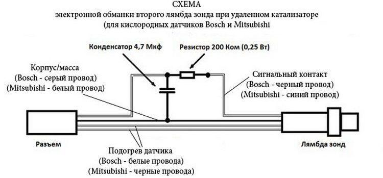 Резистор и конденсатор в можно интегрировать на авто с двумя датчиками кислорода с экологическим классом Евро-3 и выше. Электронная обманка лямбда-зонда своими руками делается так: