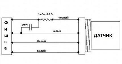 - неполярный конденсатор подключается между сигнальным проводом и массой, после резистора, со стороны разъема датчика.