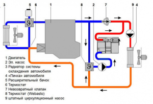 После запуска мотора он сначала циркулирует по малому кругу, минуя радиатор, а после достижения температуры около 85 °C, при которой происходит частичное открытие термостата, уходит на большой.