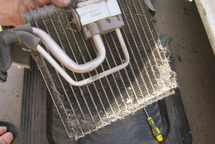 | Слабое охлаждение конденсатора (наружного радиатора кондиционера) | Конденсатор забит загрязнениями снаружи | На радиаторе кондиционера (обычно установлен возле моторного радиатора) видна грязь, листья и прочие остатки растительности и т. д. |