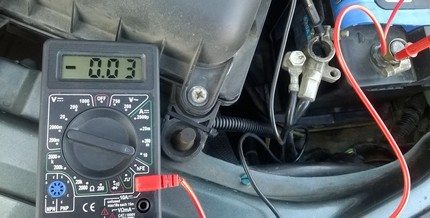- Замерить ток фонового потребления на выключенном зажигании. Для этого надо включить мультиметр в режим измерения постоянного тока 10 А (обычно для этого выделено отдельное гнездо «+» для щупа), снять любую клемму с АКБ и соединить один щуп с выводом батареи, а второй – с клеммой (полярность щупов значения не имеет). В норме потребление в состоянии покоя не должно превышать 100 мА (0,100 А). Если больше – ищите виновника.