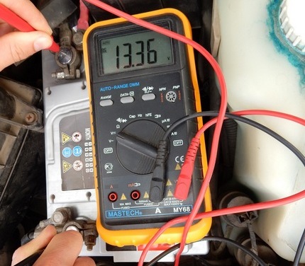 - Подключаем вольтметр в разрыв между клеммой и соответствующим выводом батареи.