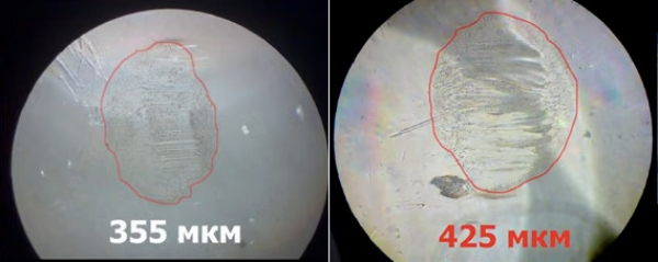 Пример смазывающей способности разных солярок: вариант слева (355 мкм) лучше, чем вариант справа (425 мкм)
