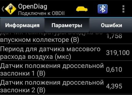 Подключаем автосканер и смотрим в приложении OpenDiag два значения: