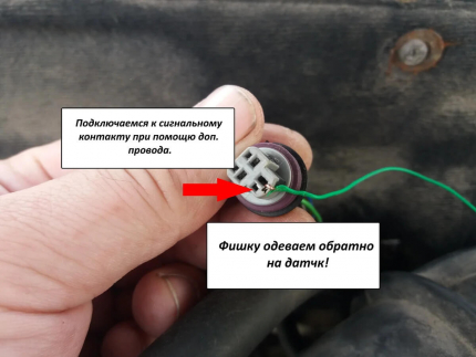 От аккумулятора отсоединяем клемму, снимаем провода с фишкой, помещаем провод на пин, который передает сигнал на бортовой компьютер и монтируем фишку на место.