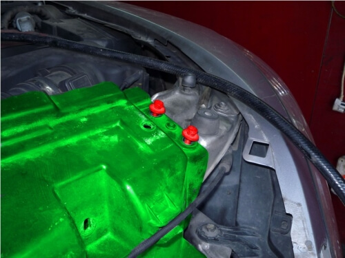 В первую очередь приступаем к снятию переднего бампера и замене охлаждающей жидкости, поэтому первой снимается пластиковая крышка двигателя и другие декоративные элементы, затем откручиваем защиту двигателя.