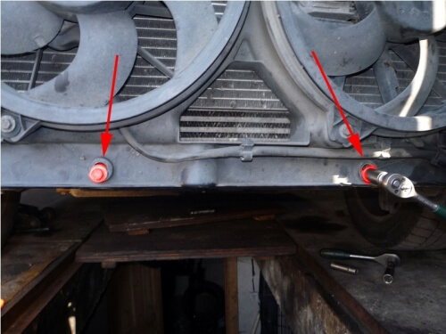 Приступаем к снятию радиатора охлаждения и вентиляторов. Начинаем снимать крепления радиатора.