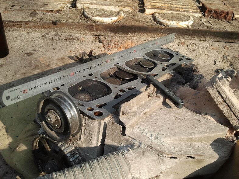 Теперь тщательно моем бензином и вытираем ГБЦ. Ни в коем случае не пользуйтесь наждачкой и тем, чем можно повредить алюминиевую ГБЦ. Нужно проверить головку, что бы сделать это нам понадобится линейка (металлическая) и набор щупов.