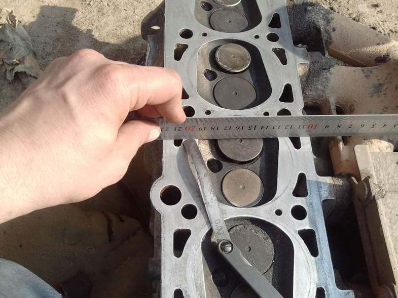 Покупаем ровную металлическую линейку. Теперь имея все необходимые инструменты, линейкой проводим по всей плоскости ГБЦ, щуп нужно умудриться подсунуть щуп под линейку.