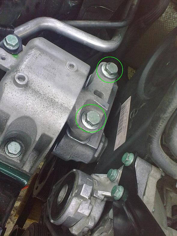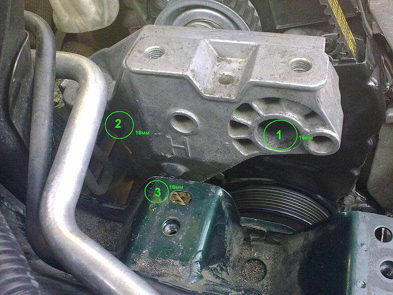 Под двигатель ставится домкрат, мотор нужно поднять так, чтобы в пассажирской подушке отсутствовало напряжения. Теперь откручиваем болты подушки от опоры, все делаем аккуратно, чтобы не появились перекосы.