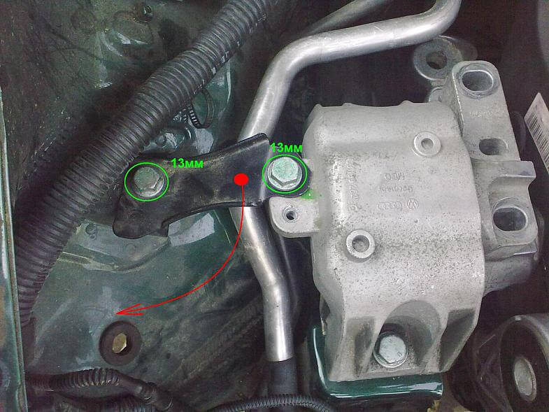 От подушки нужно открутить странную железку. Подушку тоже откручиваем. Крышку ремня снимаем, откручиваем натяжной ролик. Затем опору двигателя.