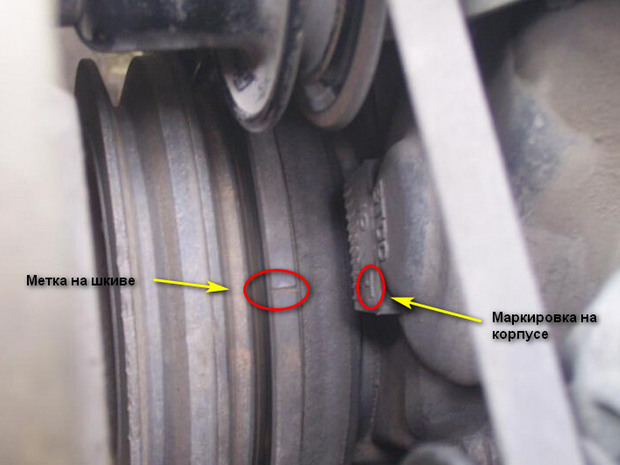 Метка на шкиве распредвала должна совпадать с меткой на корпусе