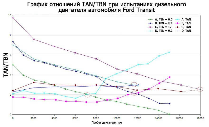 Однако перед тем как определиться, через сколько моточасов менять масло в двигателе, работающем на дизельном топливе, необходимо разобраться с одним нюансом. В частности, можно ли использовать моторные масла, имеющие низкое щелочное число (TBN), в странах с некачественным горючим (в частности, российским, в котором содержится большое количество серы)? В процессе эксплуатации двигателя, и соответственно, масла, щелочное число падает, а кислотное растет. Поэтому логично предположить. что пересечение их графиков при определенном пробеге автомобиля говорит нам о том, что масло полностью отработало свой ресурс, и далее его эксплуатация только губит двигатель. Представляем вашему вниманию графики испытаний четырех типов масел с различными показателями кислотных и щелочных чисел. Для эксперимента брались четыре типа масел с условными названиями букв английского алфавита:
