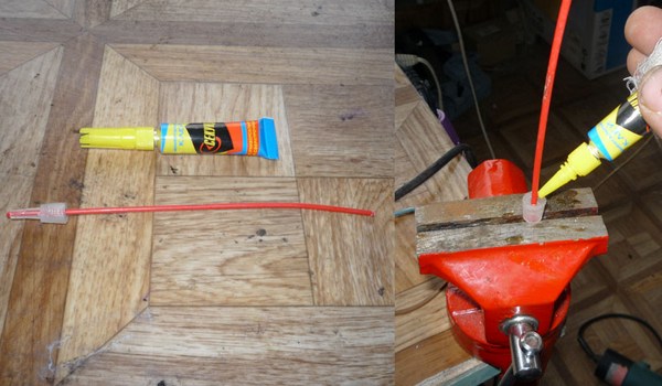 Берем колпачок от супер-клея, в него вставляем трубочку карбклинера и вливаем клей.