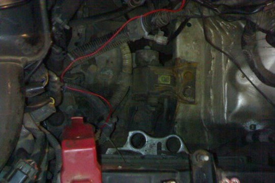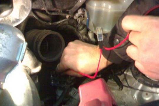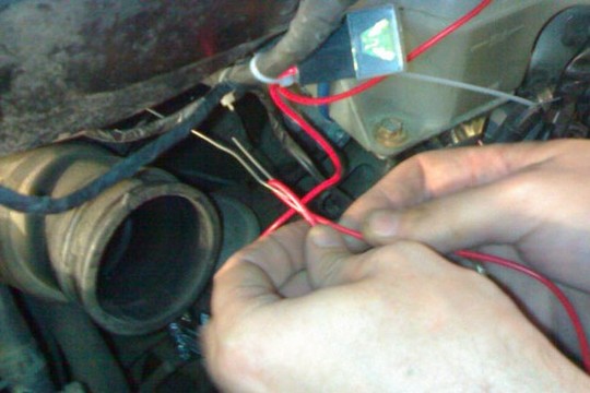 Теперь снова возвращаемся обратно под капот. Там нужно подключить к плюсовой клемме аккумулятора провод плюса, (с этим проводом мы работали первым).