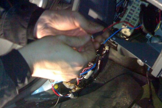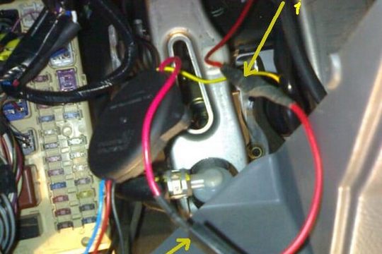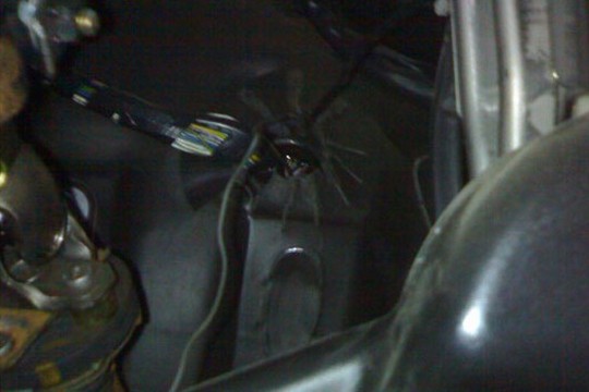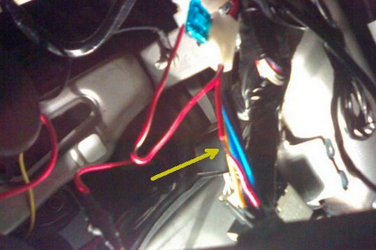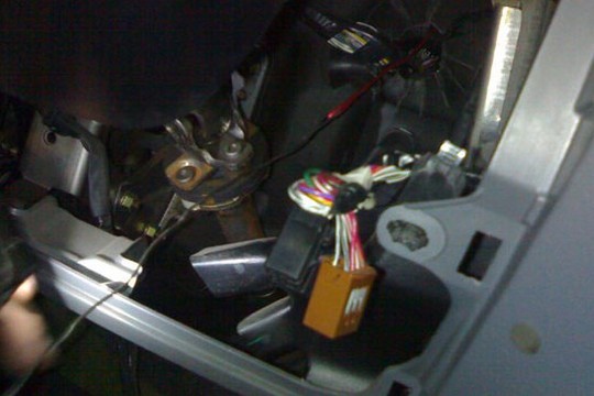 Теперь нужно снять кожух под рулем, для этого, понадобится тонкую жесткая металлическая проволочка, ее нужно продеть из салона под капот, там цепляем провод и тянем его в салон.