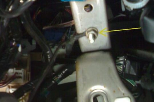 Первой нужно подключить массу. Для этого существует пустое отверстие под рулем, черный провод блока прикручивается при помощи болта и двух шайб с гайкой.