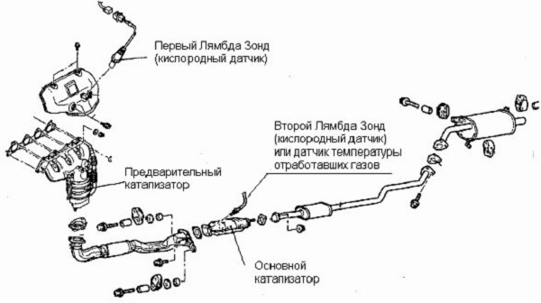В общем, в том случае, который указан на схеме выше, первый датчик кислорода не отслеживает состояние катализаторов, никак не скажутся на его показания удаление последних, второй датчик температуры придется обмануть, для этого устанавливаем обманку ввёртыш под датчик, делаем это для того, чтобы показания датчика без катализатора были равны или приблизительны тем, которые были при установленном катализаторе. В случае, если и второй датчик является лямбдой нужно быть аккуратнее, так как после удаления катализатора, скорее всего, потребуется перепрошивка блока управления двигателем (в некоторых случаях можно провести коррекцию).
