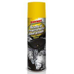 Очиститель двигателя Runway Foamy Engine Cleaner является одним из наиболее популярных и эффективных средств в своем сегменте рынка. В инструкции к средству указывается, что он с легкостью удаляет любые загрязнения, имеющиеся в моторном отсеке — пригоревшие технические жидкости, масляные подтеки, солевые дорожные остатки и просто застарелую грязь. Кроме этого, предотвращает разрушение электропроводки под капотом. Безопасен для элементов, выполненных из пластика и резины. В качестве основного моющего средства используется додецилбензолсульфоновая кислота. Она представляет собой синтетический эмульгатор, который растворяет перечисленные выше вещества и позволяет смыть даже после высыхания непосредственно эмульгатора.