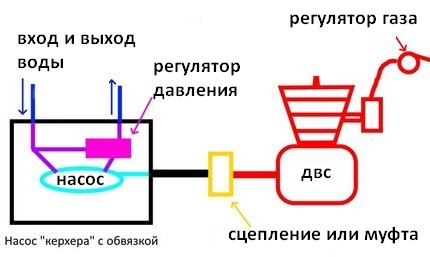 - Соединить ДВС с помпой. Если рабочие обороты мотора и насоса совпадают – через муфту, а если нет – через редуктор, зубчатую или ременную передачу.