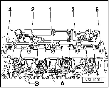 - Открутить болты крепления -В- насос-форсунок с помощью торцового ключа -T10054- и вынуть болты;
