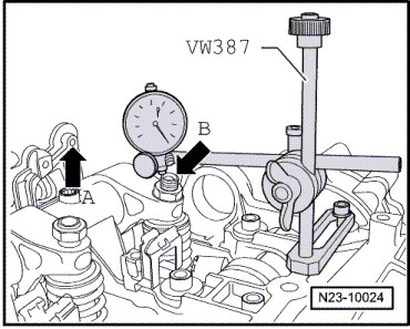 - Повернуть коленчатый вал вперёд до максимального подъёма ролика коромысла. Сторона коромысла, где установлен ролик, -стрелка A- находится в наивысшей точке. Щуп индикатора часового типа -стрелка В- находится в самой нижней точке;