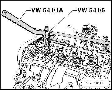 - Осторожно запрессовать насос-форсунку с помощью рассухаривателя VW 541/1 A в гнездо крепления. Удерживать её в этом положении, не снимая усилие с рассухаривателя;