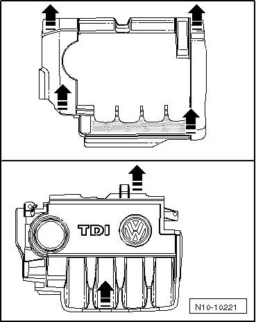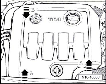 - Снять кожух двигателя, потянув его рывком сначала вверх -стрелки А -, а затем вперед, стрелка В (отсоединяя от заднего крепления);