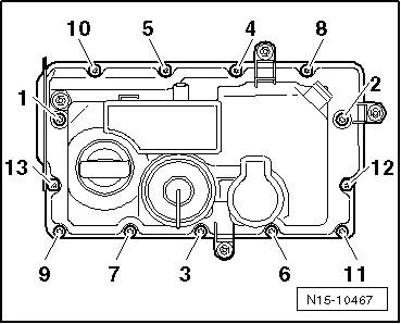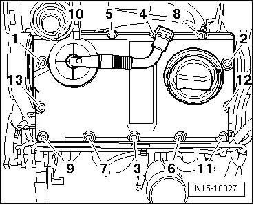 - Затянуть болты крепления клапанной крышки в последовательности -1… 13- от руки;